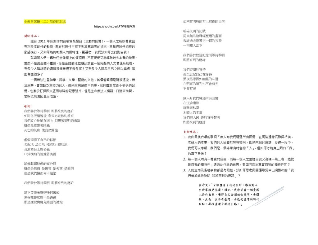 有一則關於 生命音樂廳(人學探索)放逐的記憶 的留言