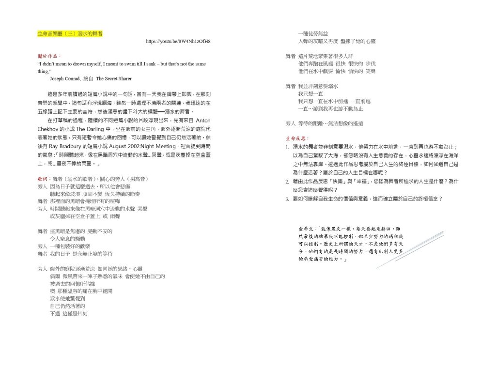 生命音樂廳(終極關懷)溺水的舞者 分類:丁國翔2020-03-192020-10-04發表於關於教育標籤:生命教育 分享此文: 按一下即可分享至 X(在新視窗中開啟) X 按一下以分享至 Facebook(在新視窗中開啟) Facebook 喜歡 正在載入... 相關 發表者:丁國翔 【以有限的能力,創造無限的可能】 致力於生命教育、音樂教育 榮獲新北市教育局生命教育New Life教師獎、 實踐大學優良品德獎。 國立新竹教育大學藝術學(音樂教育)碩士 國立臺灣大學生命教育中心結業 檢視更多文章