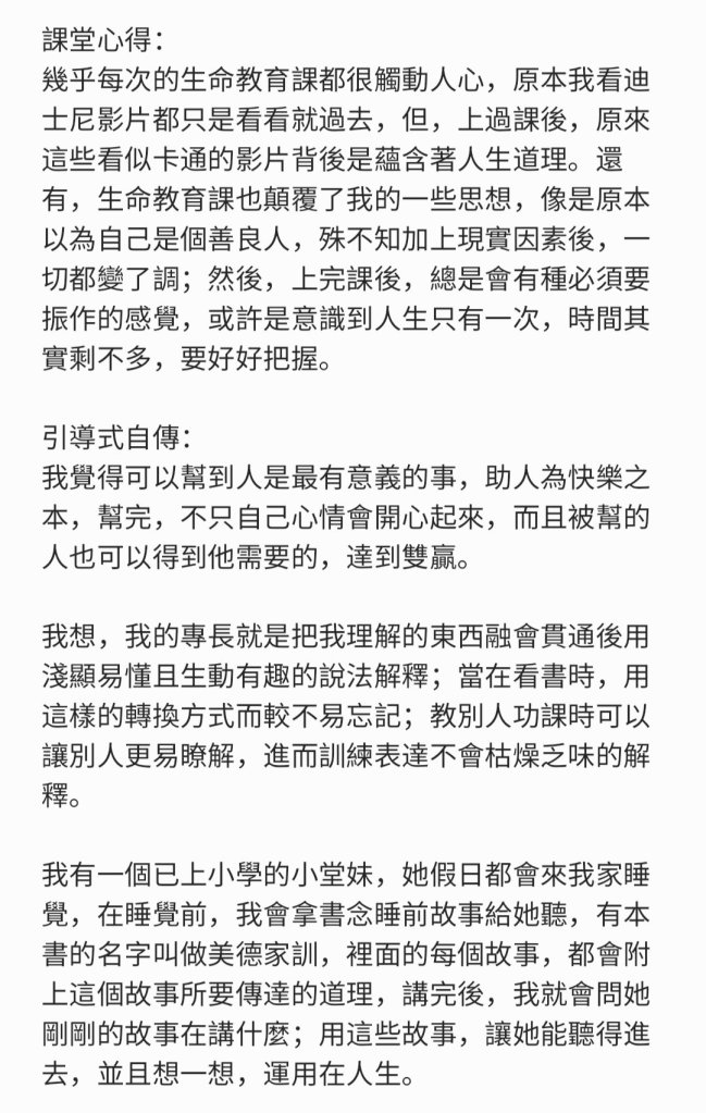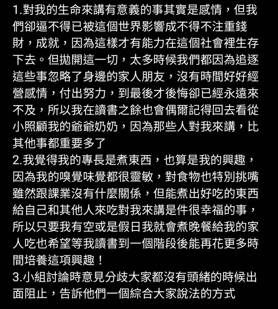 2.我的專長,我自己也還真的不知道,有什麼專長,希望在高中這階段能看到自己的專長!