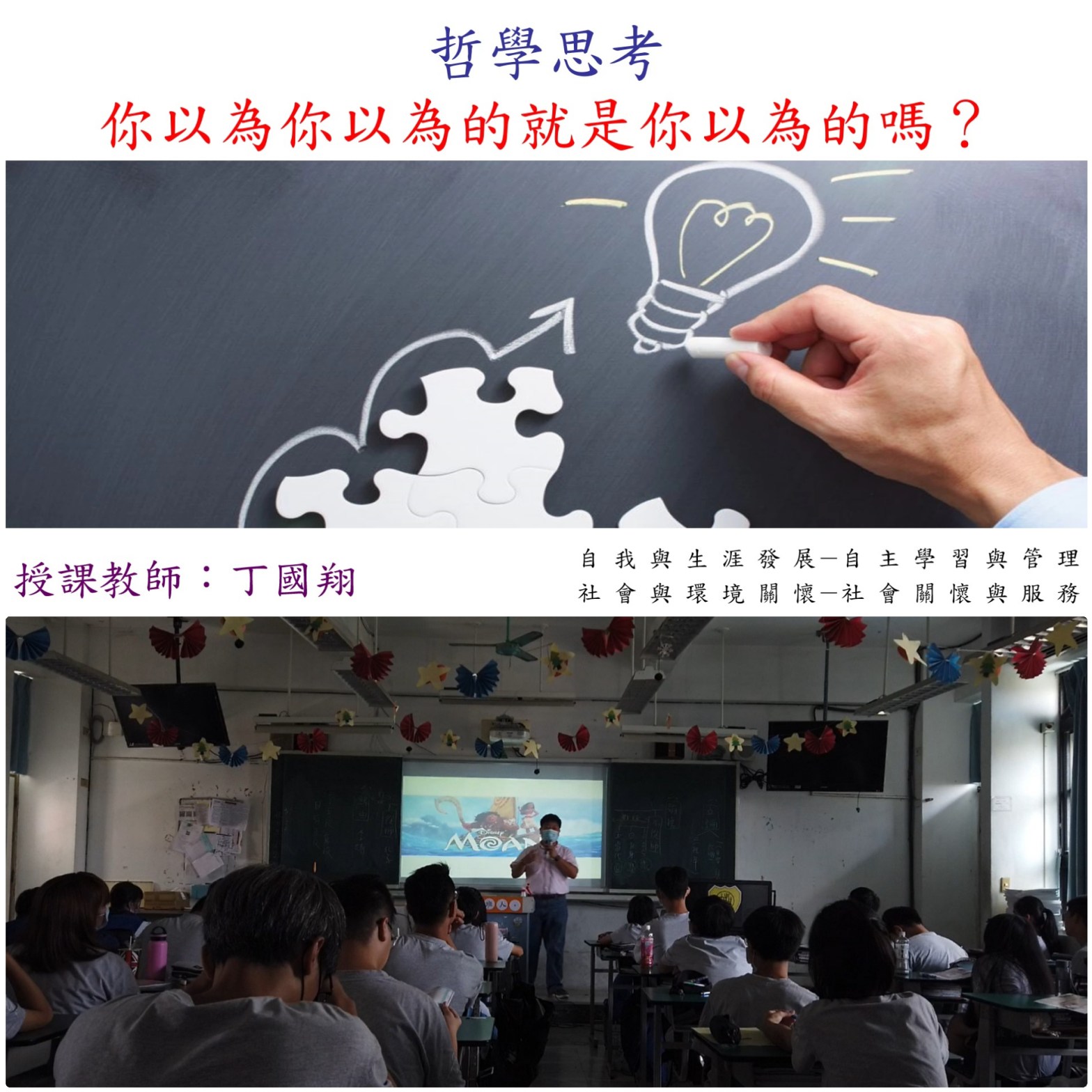 新北市板橋高中一年級109-1生命教育課程-你以為你以為的就是你以為的嗎?(哲學思考) 分類:丁國翔2020-09-182020-09-18發表於關於教育 分享此文: 按一下即可分享至 X(在新視窗中開啟) X 按一下以分享至 Facebook(在新視窗中開啟) Facebook 喜歡 正在載入... 相關 發表者:丁國翔 【以有限的能力,創造無限的可能】 致力於生命教育、音樂教育 榮獲新北市教育局生命教育New Life教師獎、 實踐大學優良品德獎。 國立新竹教育大學藝術學(音樂教育)碩士 國立臺灣大學生命教育中心結業 檢視更多文章
