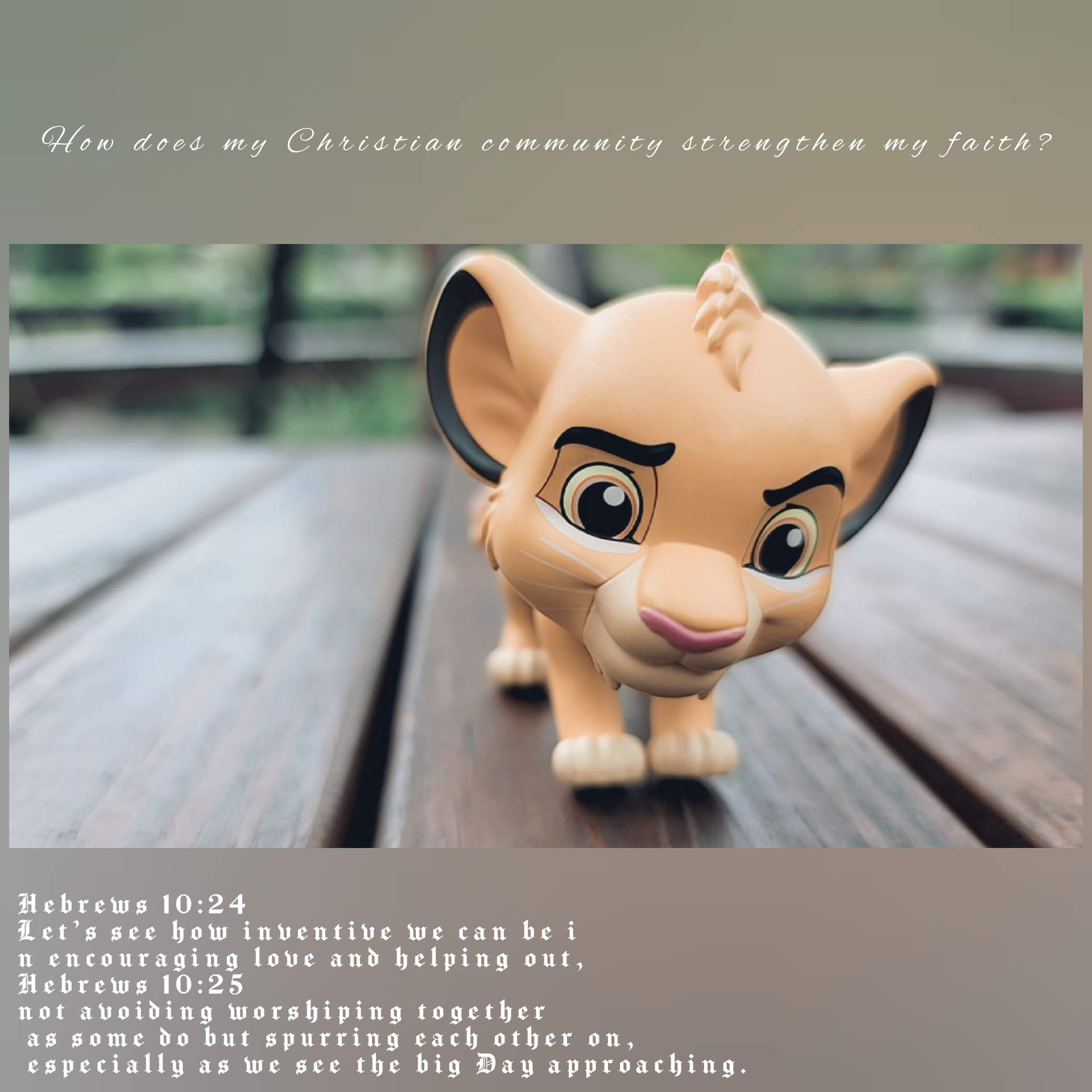 Hebrews 10:25 not avoiding worshiping together as some do but spurring each other on, especially as we see the big Day approaching.