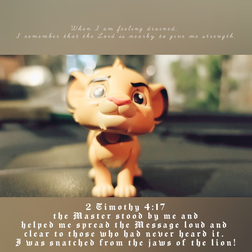 2 Timothy 4:17 the Master stood by me and helped me spread the Message loud and clear to those who had never heard it. I was snatched from the jaws of the lion!