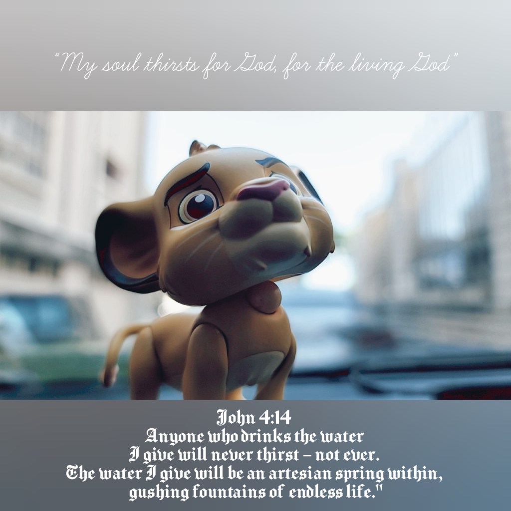 John 4:14 Anyone who drinks the water I give will never thirst – not ever. The water I give will be an artesian spring within, gushing fountains of endless life."