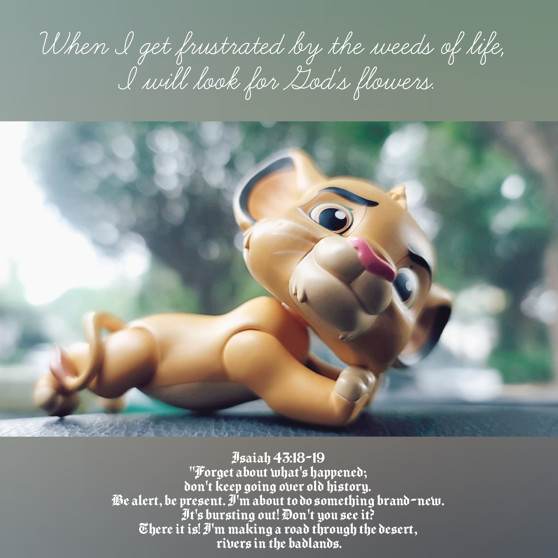Isaiah 43:18-19 “Forget about what’s happened; don’t keep going over old history. Be alert, be present. I’m about to do something brand-new. It’s bursting out! Don’t you see it? There it is! I’m making a road through the desert, rivers in the badlands.