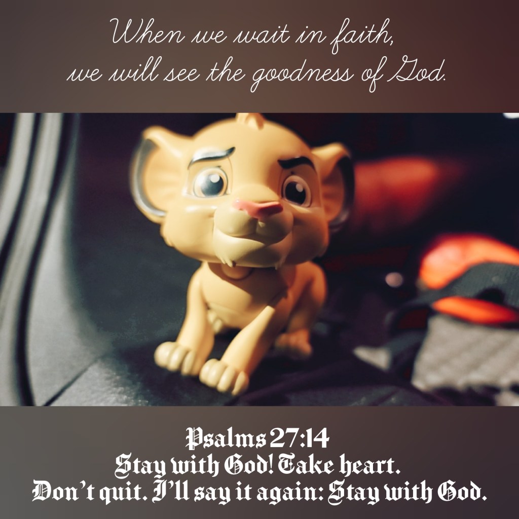 Psalms 27:14 Stay with God! Take heart. Don’t quit. I’ll say it again: Stay with God.
