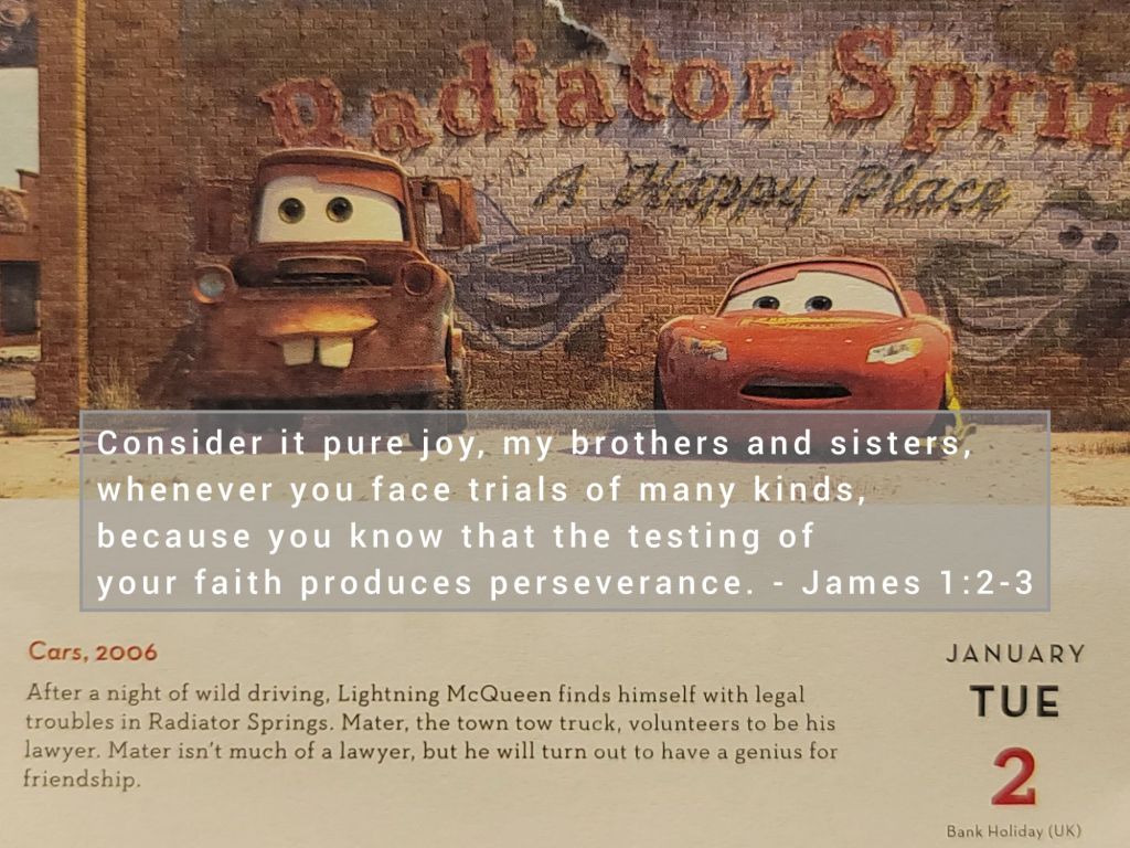 Consider it pure joy, my brothers and sisters, whenever you face trials of many kinds, because you know that the testing of your faith produces perseverance. – James 1:2-3