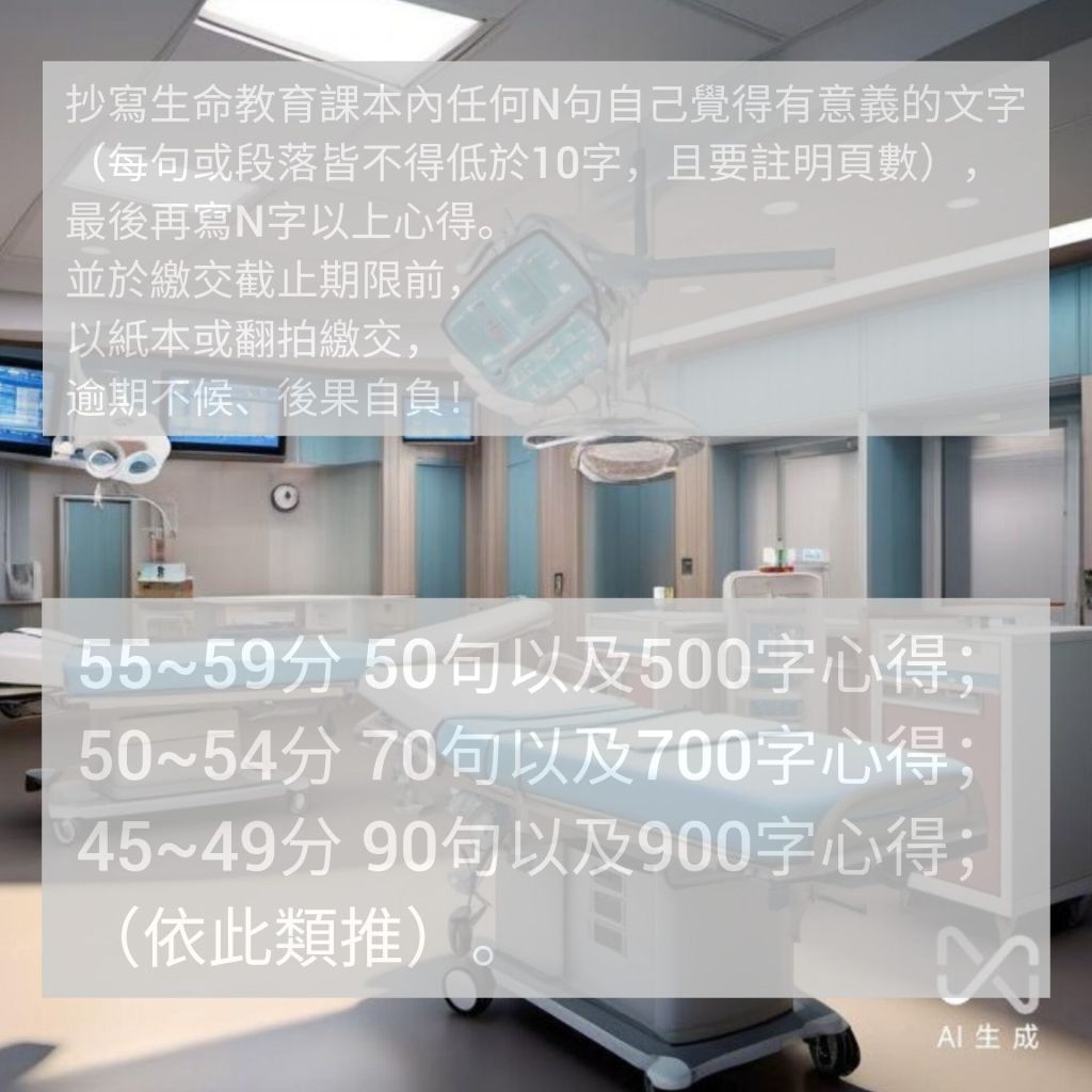 補考方式:抄寫生命教育課本內任何N句自己覺得有意義的文字(每句或段落皆不得低於10字,且要註明頁數),最後再寫N字以上心得(其中包含檢討心得、抄寫課文心得,二項目各佔1/2以上字數)。並於繳交截止期限前,以紙本或翻拍繳交(拍照內容需附課程所發之情緒小卡、或情緒單、或生命圖卡,作為補救成績通行證),逾期不候、後果自負!