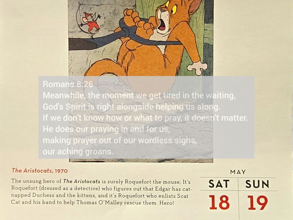 Meanwhile, the moment we get tired in the waiting, God’s Spirit is right alongside helping us along. If we don’t know how or what to pray, it doesn’t matter. He does our praying in and for us, making prayer out of our wordless sighs, our aching groans.