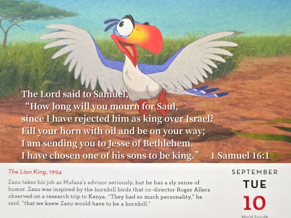 The Lord said to Samuel, “How long will you mourn for Saul, since I have rejected him as king over Israel? Fill your horn with oil and be on your way; I am sending you to Jesse of Bethlehem. I have chosen one of his sons to be king.” – 1 Samuel 16:1