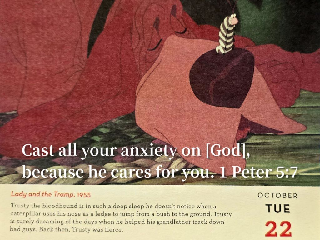 這張圖片結合了《小姐與流浪漢》(1955年)的畫面與聖經經文「將一切的憂慮卸給神,因為他顧念你們」(彼得前書 5:7)。圖片中,血犬特斯蒂(Trusty)睡得很熟,一隻毛毛蟲甚至用它的鼻子當踏腳石。文字描述特斯蒂過去曾幫助爺爺追捕壞人,英勇無比,如今它在夢中重溫往昔的輝煌歲月。整體而言,圖片以溫馨的畫面與聖經經文形成對比,呼應了將焦慮卸給上帝的訊息,並藉由特斯蒂的形象傳達出過去的英勇與當下的寧靜。