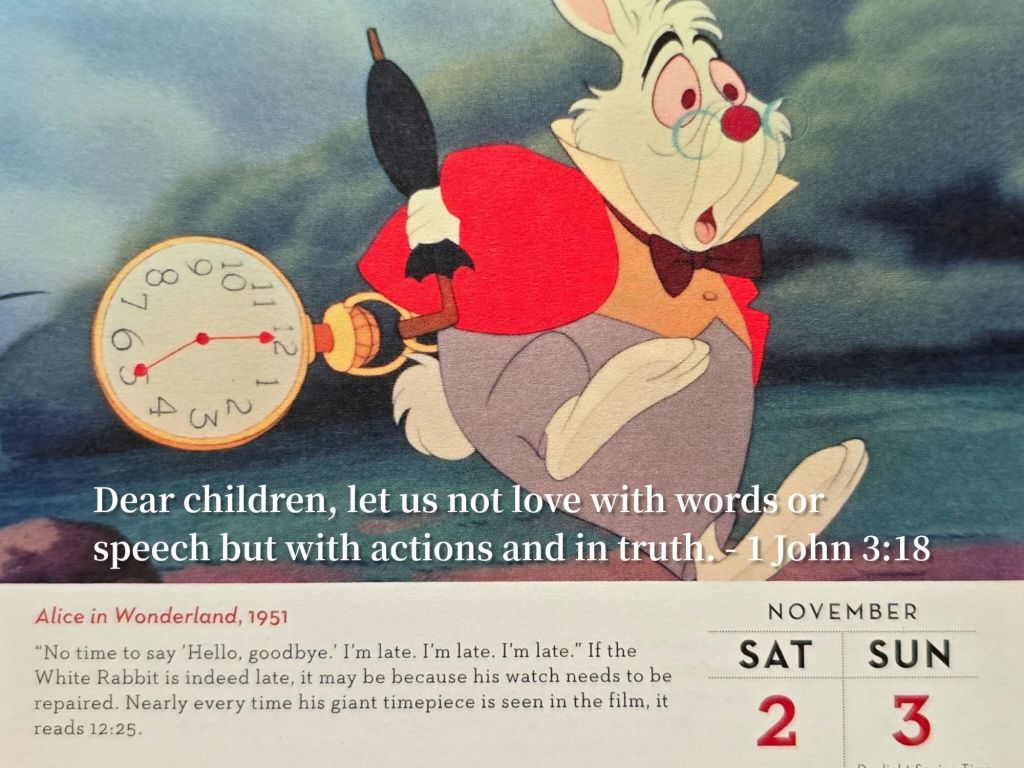 行動而非言語來展現愛與真理,並引用約翰一書3章18節作為佐證。行動反映信仰,並在每個人身上看到神性或佛性以及人性、先愛先給。圖片中白兔手錶的時刻停留在12:25,呼應了愛麗絲夢遊仙境電影中白兔總是遲到的情節,暗示時間的緊迫感,與文字中強調行動的重要性形成微妙對比。積極、利他、注重行動而非言語的價值觀是很重要的。