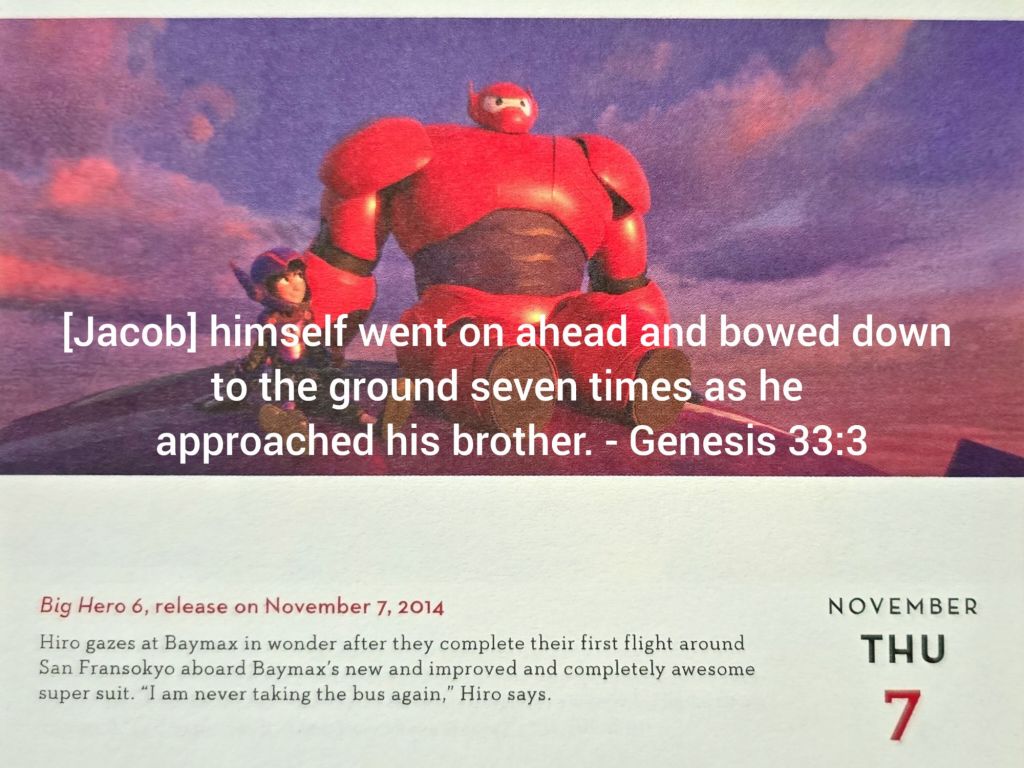圖片巧妙地將聖經故事(雅各向以掃下拜七次)與迪士尼電影《大英雄天團》結合,以達到傳達謙卑和感恩訊息的目的。 聖經故事中,雅各的謙卑行為換來了與兄弟的和解,突顯了謙卑能帶來恩典和修復人際關係的正面力量。這與《大英雄天團》中主角們的合作精神和互助互愛呼應。 雖然兩者情境不同,但都體現了同樣的核心價值:透過謙卑和感恩的心態,可以創造積極的結果,無論是在個人人際關係,或是團隊合作上,都能促進和諧與進步。