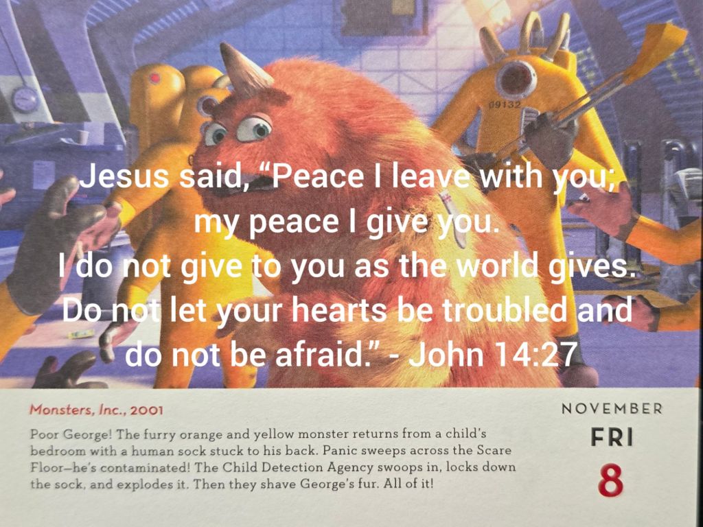《怪獸電力公司》場景描繪了毛怪喬治因為沾到人類的襪子而引發恐慌,卻最終透過機構的介入解決了問題。即使面對突發狀況,也能保持冷靜,積極尋求解決方法,最終克服困難;不論遭遇什麼挑戰,都能透過禱告和積極的應對方式,保持內心的平靜與堅定。