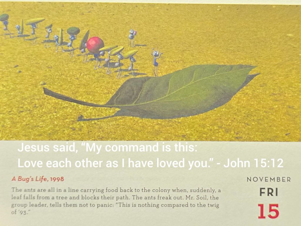 螞蟻搬運食物的畫面與「彼此相愛」的聖經教導連結起來,是藉由螞蟻合作無私的行為,來隱喻人類應彼此相愛、互相扶持的精神。 螞蟻們即使遇到障礙(落葉),仍舊團結一致,共同克服困難,這體現了奉獻與合作的精神。 呼應了約翰福音15章12節中耶穌的教導:「我賜給你們一條新命令,乃是叫你們彼此相愛;我怎樣愛你們,你們也要怎樣相愛。」藉此說明愛與奉獻不只是言語,更應體現在行動上,如同螞蟻們的合作行為一樣。 螞蟻的合作模式,成為了「彼此相愛」的具體化實例,將抽象的愛轉化成具體可見的行動。