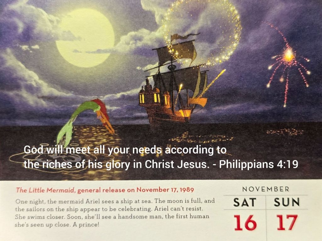 豐盛富足的生活來自於神的恩賜,活出付出的生活。 腓立比書4章19節「我的神必照著祂豐盛的榮耀,在基督耶穌裡,使你們一切所需用的都充足。」 神會滿足人們的一切需要,且不會讓我們缺乏,並鼓勵我們在每個人身上看到神或佛陀以及人性的本質,並以愛與付出為先。 《小美人魚》中艾莉兒看到船隻慶祝的畫面,來比喻滿足渴望的意象,呼應了前文神滿足需求的論述。 神會如同童話故事一般,滿足我們一切的需要。