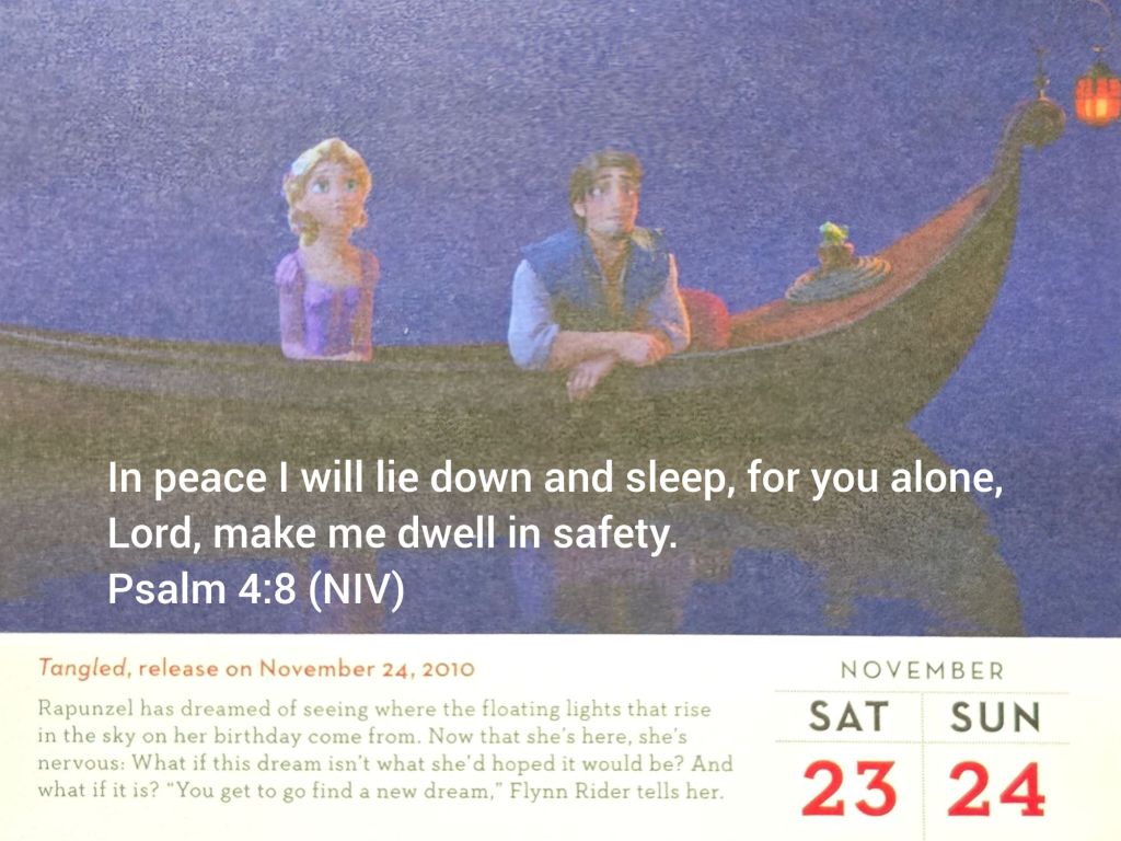 《魔髮奇緣》電影與聖經詩篇第4篇8節的關聯在於和平與安全的刻畫。畫面顯示樂佩和費林安靜地坐在小船上,呼應了經文中「我必平平安安地躺下睡覺,因為獨有你,耶和華啊,使我安然居住。」的意境。這種並置視覺上強化了這樣的想法:正如電影結尾場景所描繪的,找到和平與安全反映了詩篇4篇8節中所描述的精神上的平安。因此藉由上帝我們終能克服挑戰後找到穩定生活和內心平靜的故事。