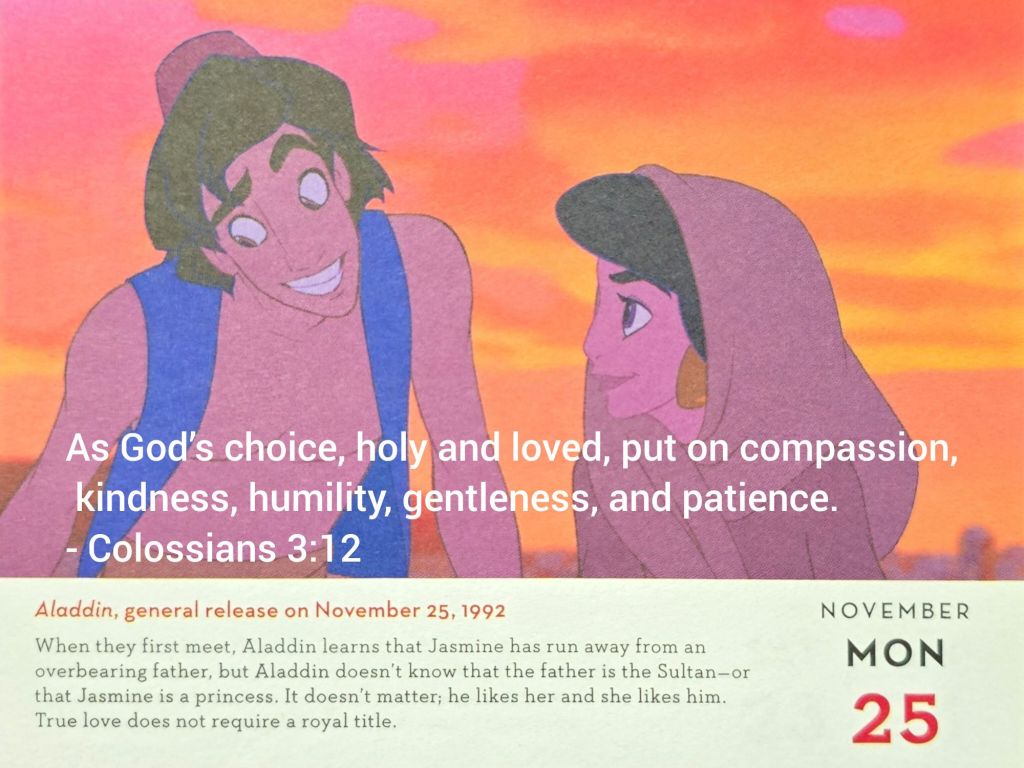 阿拉丁與茉莉公主的愛情故事作為信仰的比喻。阿拉丁不知道茉莉公主的公主身份,也不在意她的社會地位,只因彼此互相喜歡而相愛。這點呼應了信仰中真誠的內涵,說明真愛並不需要華麗的包裝或世俗的標籤。 信仰的真誠如同阿拉丁對茉莉公主的真摯情感,不因外在條件而改變,而是基於內在的吸引和欣賞。 這種真誠的愛超越了社會地位和物質條件的限制,與信仰追求內在真誠的價值觀相契合。 因此信仰中的真誠應當超越外在的虛飾,著重於內心的真實情感和價值。