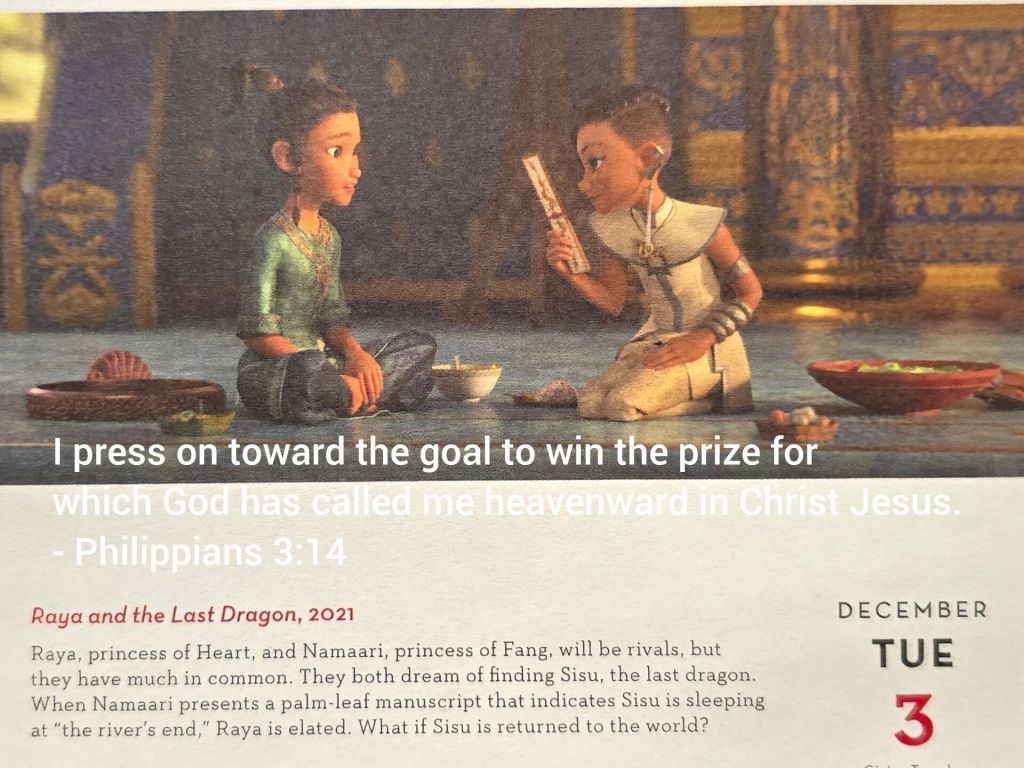 《尋龍使者 拉雅》電影的情節中,拉雅和娜瑪莉儘管互相敵對,卻有著共同目標——尋找最後的巨龍,這反映了個人致力於遵從上帝旨意的狀態。找到希蘇代表著追求腓立比書3:14中提到的「獎賞」,這裡將其解釋為靈性獎賞或天國的救贖。儘管存在最初的衝突,但合作尋找希蘇的過程可以象徵信仰的合作本質,或者是在靈性成長道路上克服障礙。希蘇位置的發現被呈現為狂喜的時刻,這與信仰加深帶來的喜樂和滿足感相呼應。