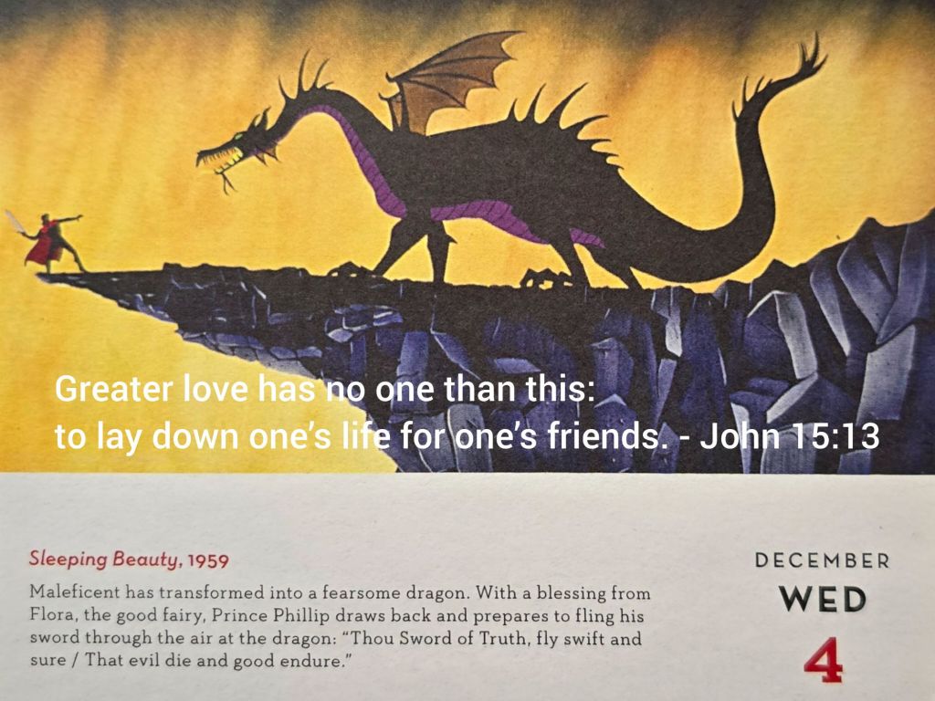 《睡美人》中梅菲瑟化身為巨龍,王子持劍迎戰的場景,除了突顯犧牲的愛,也暗示了愛中其他重要元素:勇敢 (Courage): 王子面對強大的邪惡勢力(象徵困難或挑戰),仍勇於挺身而出,展現了愛中必要的勇氣。善惡的對抗 (The struggle between good and evil): 梅菲瑟代表邪惡,王子則代表善良。這個場景體現了愛往往需要與邪惡抗爭,保護所愛之人。 希望與勝利 (Hope and victory): 儘管面對巨大的挑戰,王子依然選擇戰鬥,這象徵著即使在最艱困的環境中,愛依然能帶來希望,最終走向勝利(打敗邪惡)。