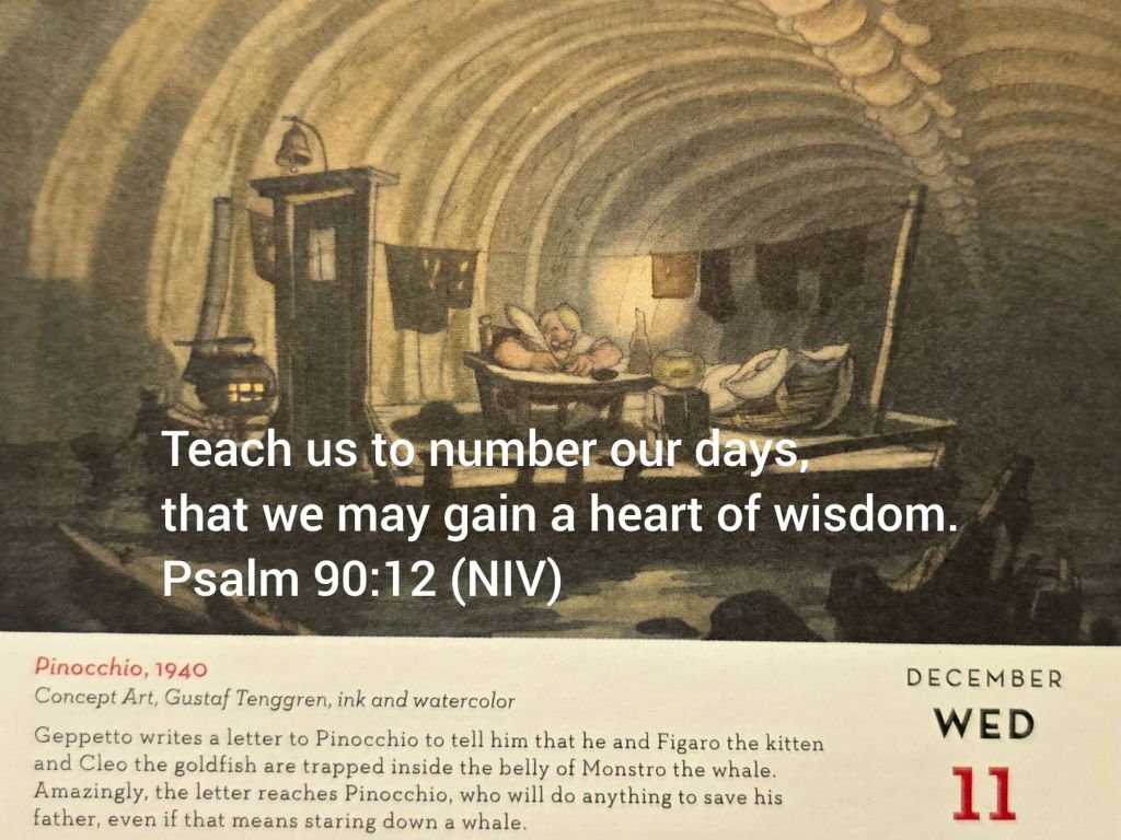 詩篇90:12強調要學習數算自己的日子,好叫我們得著智慧的心。 皮諾丘的冒險充滿了危險和挑戰,每一次的經歷都教導他寶貴的經驗。這呼應了詩篇中「數算日子」的意涵,提醒我們要珍惜有限的時間,並從每個經驗中學習成長,這是一種獲得智慧的過程。 皮諾丘被困在鯨魚肚子裡,面對絕境,吉佩托仍然寫信給他,表達無盡的父愛與希望。這展現了即使在最艱困的處境中,也要保持希望和堅毅,積極尋求解決方法,這也是智慧的展現。 木匠吉佩托的行動更凸顯了即使在困境中也要保有愛與希望的重要性。 吉佩托不放棄皮諾丘,展現出無私的父愛。這種愛與支持,成為皮諾丘面對困境的動力,也暗示著在生命的旅程中,良善的人際關係與愛是重要的支柱,能幫助我們在面對挑戰時保持堅定。