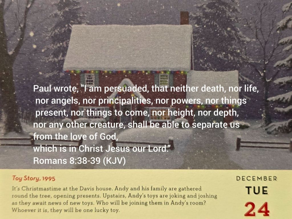 羅馬書 8章38至39節 強調無論任何境遇,神的愛都無法分離。 《玩具總動員》的片段則呈現了友誼和期待的氛圍。玩具們等待著新玩具的到來,如同我們在生活中等待著未知的挑戰和恩典,這份期待和友誼,就像神無條件的愛,即使面對聖誕節帶來的未知,也依然存在。在困境中保持積極和盼望,即使面臨可能被取代的焦慮,卻依然保有友誼和樂觀的精神相呼應。 它們都說明了即使環境變化,即使面臨未知的挑戰 (新的玩具加入),內在的正面態度和對愛與友誼的堅持仍然至關重要。