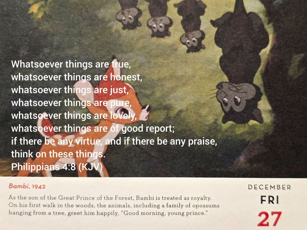 真實和誠實是基礎,是所有其他特質的根本。沒有真實和誠實,其他的特質都無法建立。公正建立在真實和誠實之上,確保公平待人處事。純潔和美德是內在品格的展現,反映出一個人的內心世界。純潔代表內心的純淨無瑕,美德則是良好的道德品質。可愛、有好名聲和值得讚美的事物,則體現了這些內在品格的外在展現。可愛是一種討喜的性格特質;有好名聲反映出他人對你的正面評價;值得讚美的事物則是個人行為和貢獻受到肯定的結果。如同迪士尼電影《小鹿斑比》的片段描述,呼應經文所提及的「可愛」和正面積極的意象,追求積極正面的人生態度。