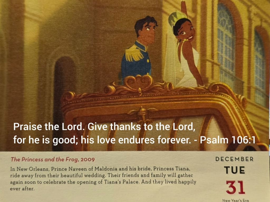 《公主與青蛙》電影中公主和王子結婚的幸福結局,來比喻並強化自己對上帝恩典的感恩之情。 電影中「happily ever after」的結局,象徵著一種持續且美好的祝福,這與詩篇106篇1節中「要因他的慈愛永遠長存」的意境相符,以此來表達對上帝恆久之愛的感激。