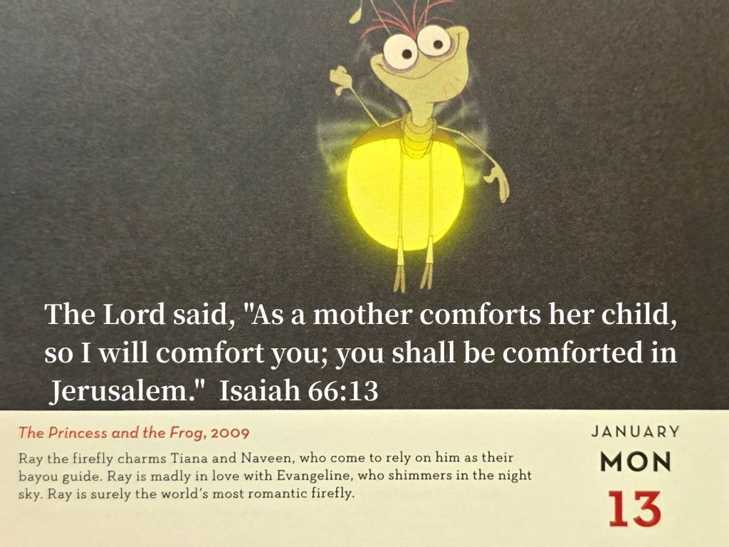 以賽亞書66章13節提到上帝如同母親般安慰兒女,給予信心、喜樂和盼望。人們應以便利待人、寬容待人、勇於道歉,呼應上帝慈愛的本質。《公主與青蛙》Ray作為指引的螢火蟲,默默付出,且對愛堅定不移,正好體現了經文中所提倡的以愛和寬容待人的精神,以及為他人帶來信心、喜樂和盼望。