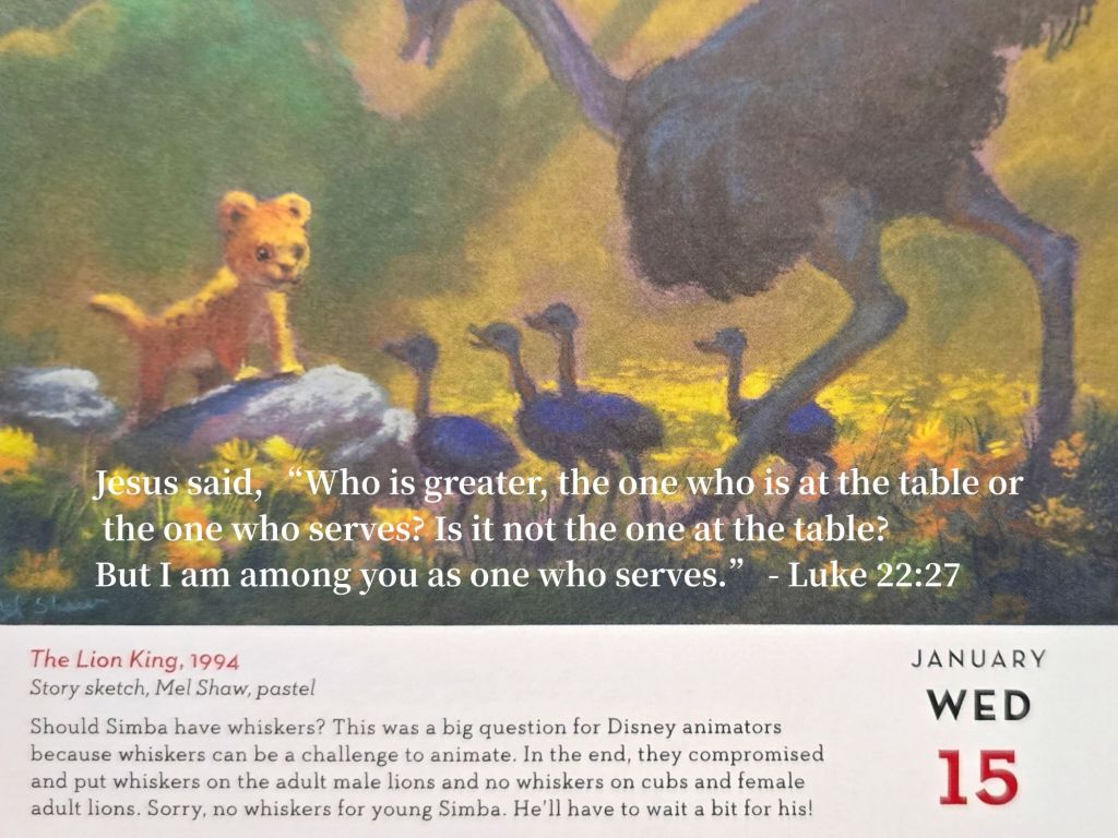 成年雄獅辛巴長鬍鬚代表著權威、成熟和責任,而這與耶穌在路加福音中所說的「服事」精神形成對比。耶穌指出,服事者才是真正偉大的,這與世俗權威的象徵(鬍鬚)有著反差。 迪士尼動畫師的決定,選擇讓成年雄獅有鬍鬚,而幼獅和母獅沒有,可以詮釋為:權威和服事並非互相排斥。成年雄獅擔負著領導和保護的責任(如同權威),但這並不意味著他不服事,甚至他的領導本身就是一種服事。 這個決定暗示了,真正的服事,可能包含權責,但更重要的核心是謙卑和奉獻的精神,而非表面的權威象徵。 因此,辛巴的鬍鬚這個細節,也隱喻了服事不應僅止於表面的謙卑,更應肩負起相應的責任與付出。