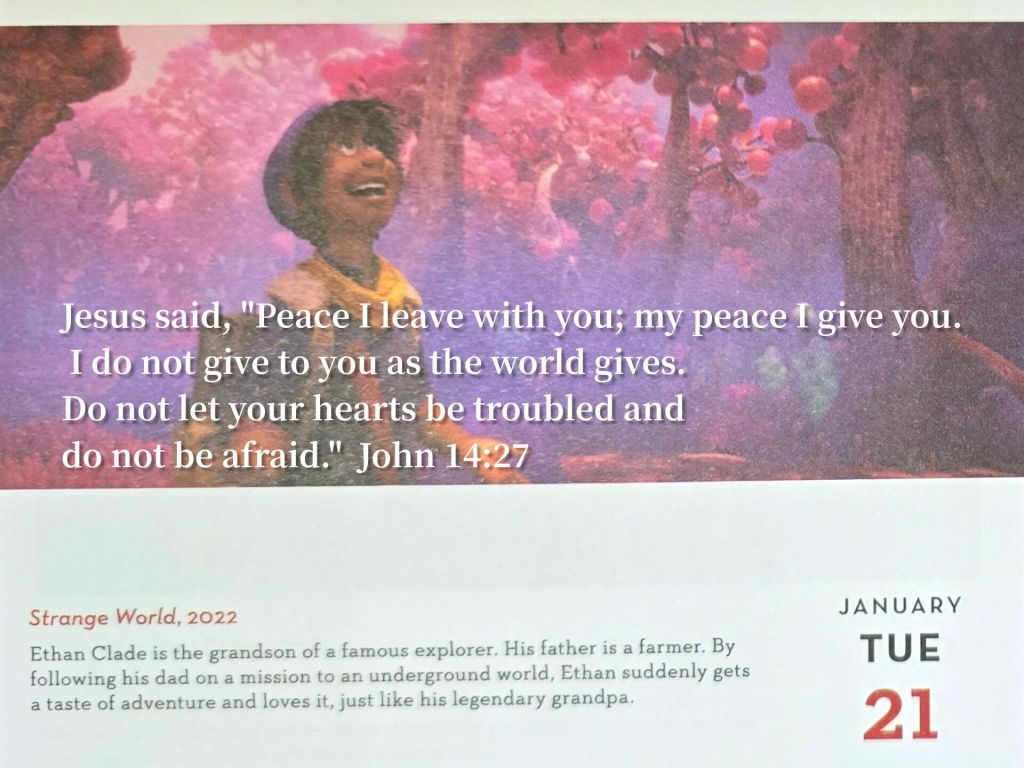 約翰福音14:27 經文「我留下平安給你們;我將我的平安賜給你們。我所賜的,不像世人所賜的;你們心裡不要憂愁,也不要膽怯。」是一種來自信仰的內心平靜,電影《奇異世界》而Ethan追隨父親踏上未知的地下世界旅程,這段冒險過程雖然充滿挑戰與未知,但如同經文中所說,藉由信仰或個人的勇氣與決心,也能在困境中找到內心的「平安」,並享受過程中的冒險與樂趣。 因此即使面對冒險與挑戰,也能保有內心平靜與積極的態度。