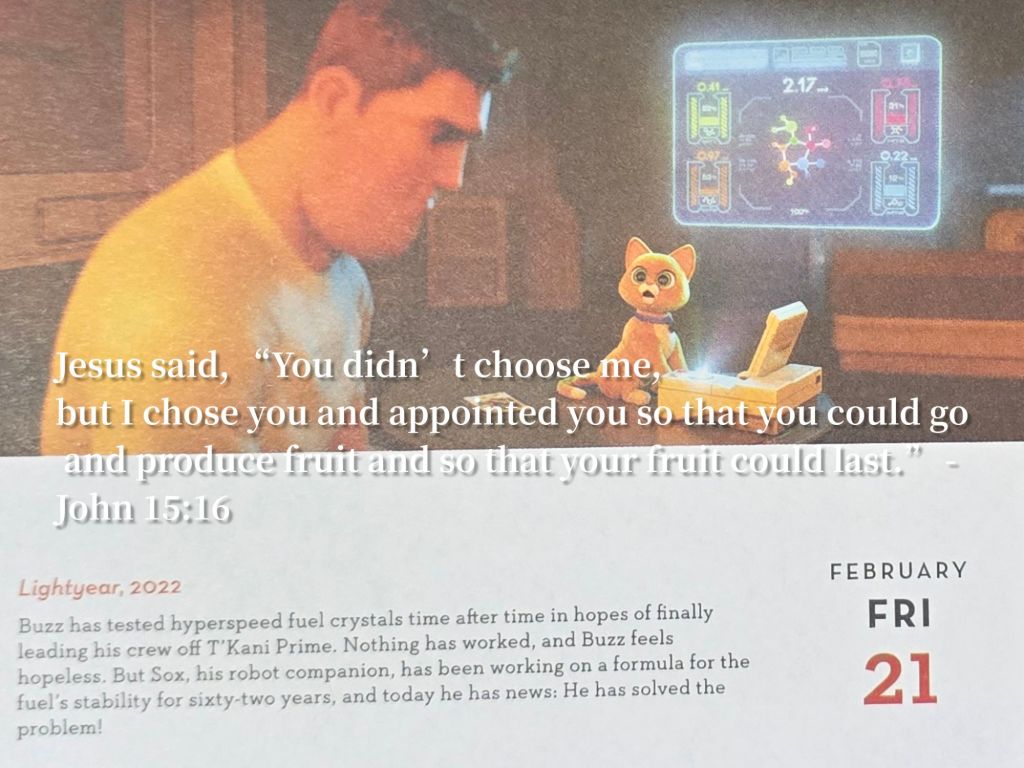 Jesus said, “You didn’t choose me, but I chose you and appointed you so that you could go and produce fruit and so that your fruit could last.” – John 15:16