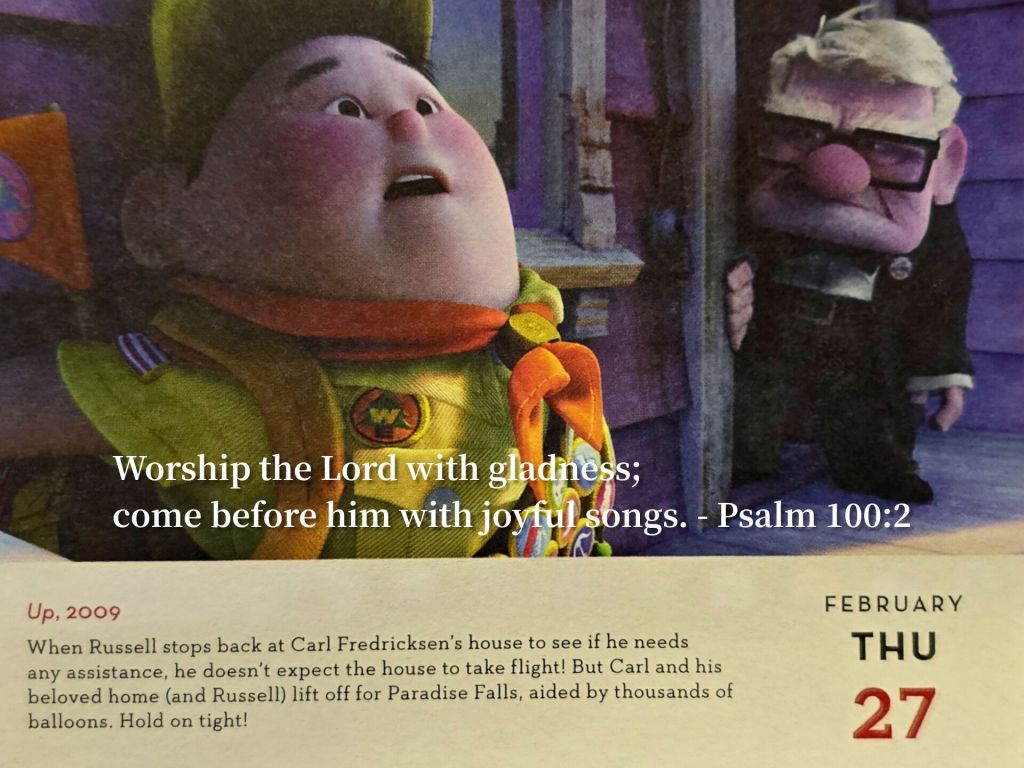在皮克斯動畫電影《天外奇蹟》中,卡爾和小羅在冒險旅程中,經歷了無數驚險和感動的時刻,但他們始終懷抱著對冒險的熱情,並充滿希望地追尋夢想。卡爾與小羅互相扶持,克服了沿途的種種困難,這展現了他們堅定的信念以及無懼的精神。 這可以視為在敬拜神中,即使遭遇挑戰,仍舊保持喜樂與信心的精神。