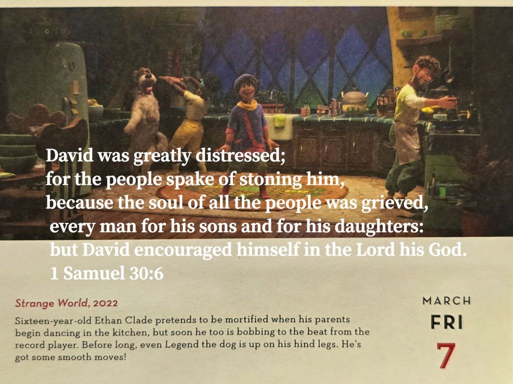 David was greatly distressed; for the people spake of stoning him, because the soul of all the people was grieved, every man for his sons and for his daughters: but David encouraged himself in the Lord his God. 1 Samuel 30:6