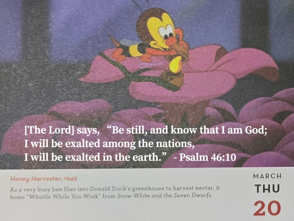 正如圖片中,辛勤的小蜜蜂飛進唐老鴨的溫室採集花蜜,正如《白雪公主》裡七個小矮人快樂地歌唱「Whistle While You Work」,在上帝的帶領下,辛勤耕耘必有豐收!