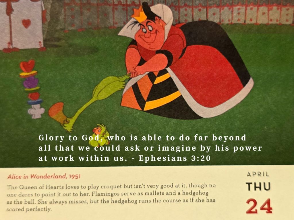 就像《愛麗絲夢遊仙境》,紅心皇后喜歡玩槌球,但是她其實並不擅長。 雖然沒有人敢當面說出來,而且規則總是不停改變,火烈鳥當作槌桿,刺蝟當作球。她總是打不到,但是刺蝟總是像得分一樣的跑完所有球道。就算看起來一團亂,但似乎又順利完成?神也能用超乎我們所求所想的方式來運行。