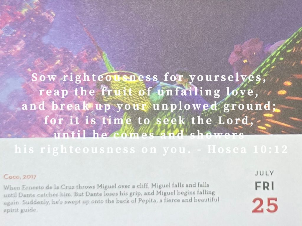 Sow righteousness for yourselves, reap the fruit of unfailing love, and break up your unplowed ground; for it is time to seek the Lord, until he comes and showers his righteousness on you. – Hosea 10:12