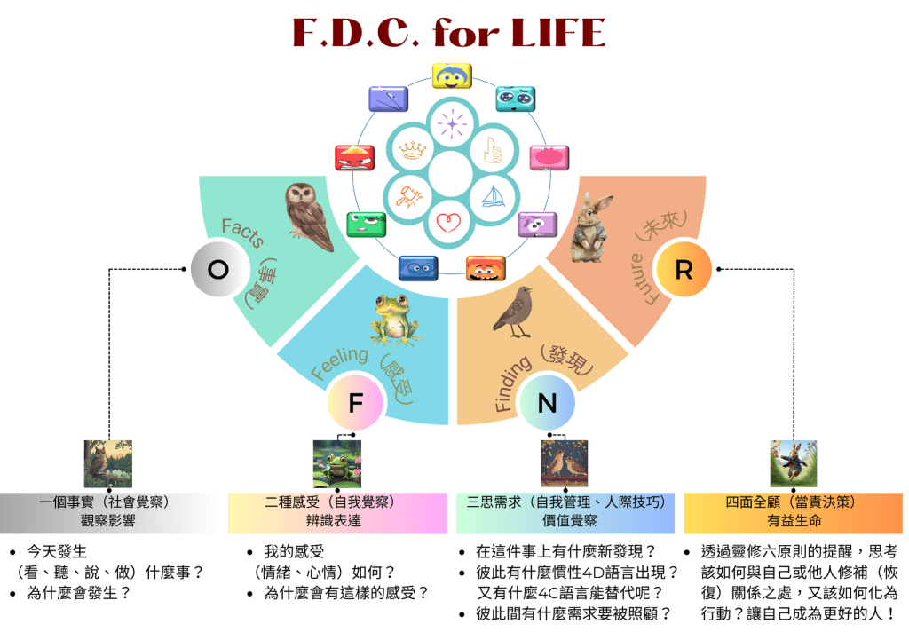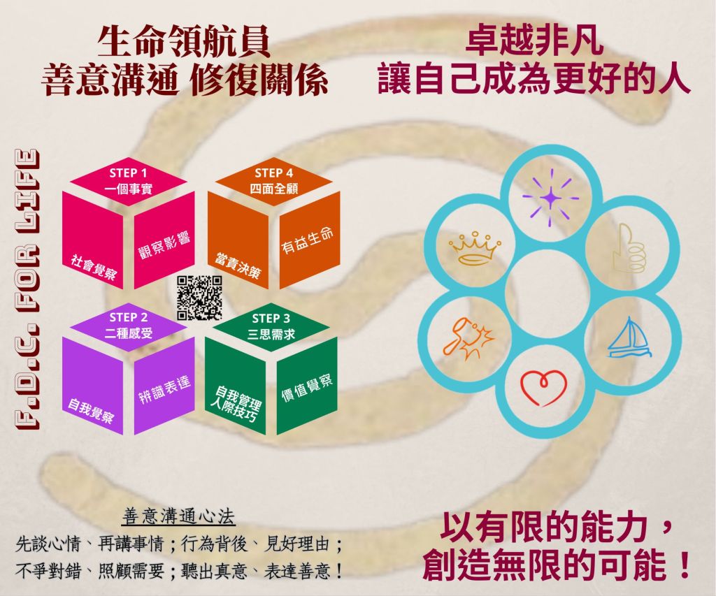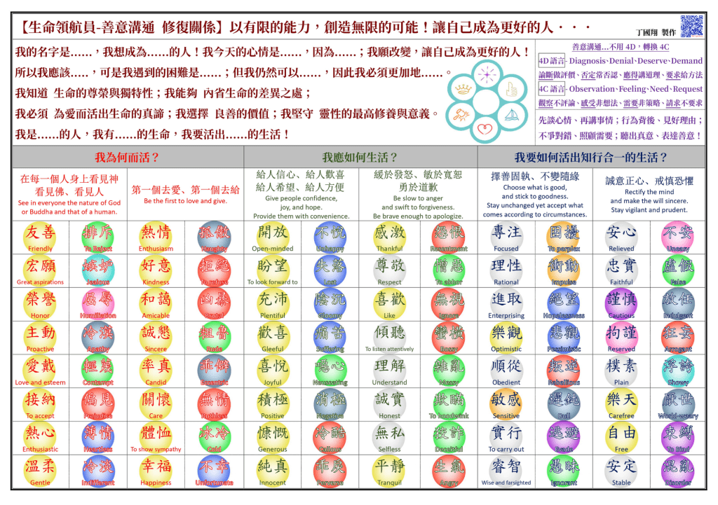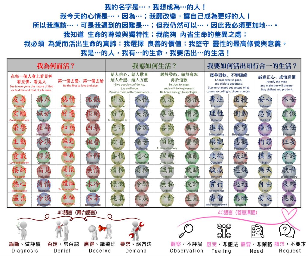 | 價值思辨 | 19.主動/冷漠 1. 為什麼我們要對生命行「良善」的事? 2. 行善的動機是該基於事實環境所求?還是受生命價值所驅?為什麼? 3. Have you ever thought that you shouldn’t be like this? | 20.誠懇/粗魯 1. 為什麼「良善」是需要有行動力的? 2. 在良善的價值行動中,需要什麼樣的條件? 3. Usually you talk or listen? (你通常是說話還是聆聽?) | 21.歡喜/痛苦 1.「如何行動才能行出『良善』的生命?」 2.「在價值的取捨中,有哪些是屬於正確的行為?」 3. How do you get over it when you’re depressed? | 22.傾聽/蠻橫 1.何作為能修復生命,活出「良善」? 2. 在事實的辨別與價值的抉擇間,什麼樣的態度能讓彼此關係更融合? 3. Have you ever had an experience that your imagi- nation came true ? | 23.樂觀/悲觀 1. 什麼樣的「良善」堅持,該在衝突的生命中落實? 2. 什麼樣的價值是該持守的? 3. What are you trying to do for tomorrow that is better than now? | 24.拘謹/狂妄 1.「什麼樣的態度,能秉持『良善』而落實生命的義務,為愛而行善?」 2.「如何發揮更大的生命價值?」 3. If you were an animal, what kind of animal would you be? |