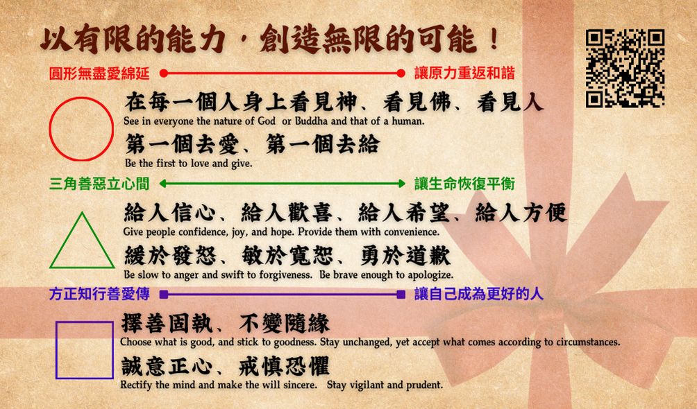 | 在每一個人身上看見神 看見佛、看見人 | 第一個去愛、第一個去給 | 給人信心、給人歡喜 給人希望、給人方便 | 緩於發怒 敏於寬恕、勇於道歉 | 擇善固執、不變隨緣 | 誠意正心、戒慎恐懼 | |